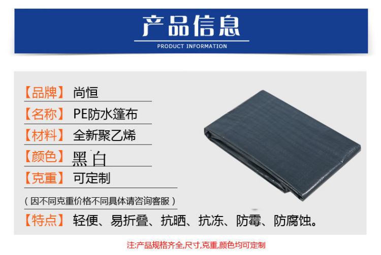 產品介紹黑白色PE防水篷布產品信息黑白色PE防水篷布立體包邊,加厚設計,邊緣美觀結實,使用壽命長,鍍鋅扣眼黑白色PE防水篷布牢固包角,···