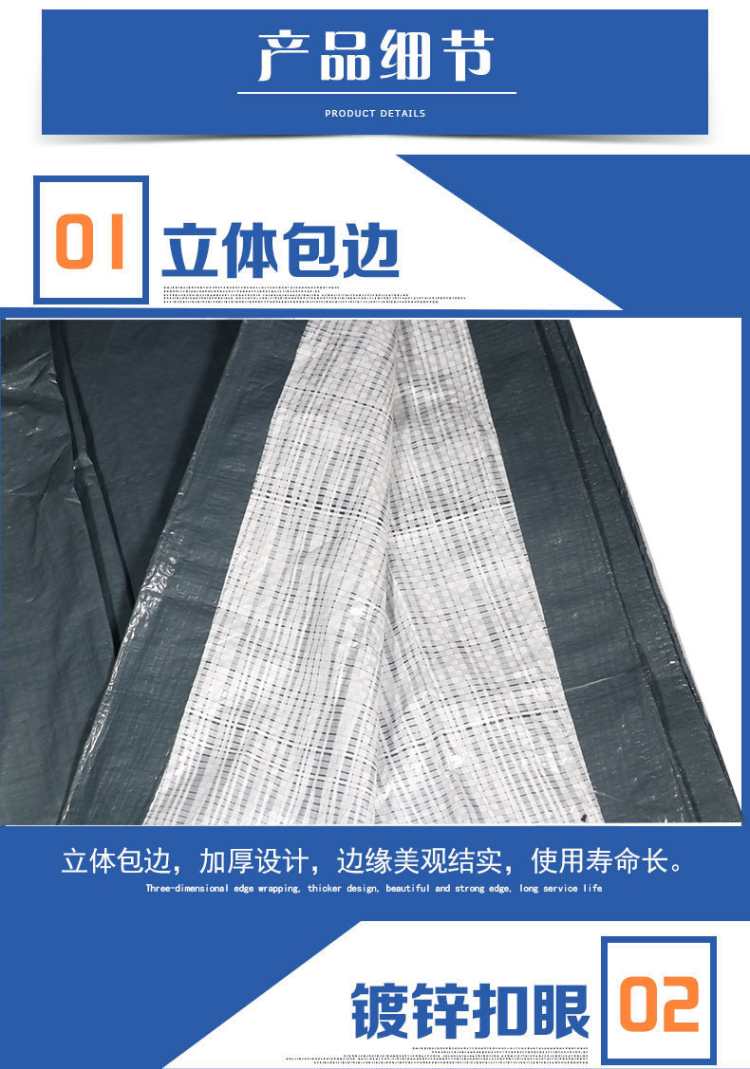 黑白色PE防水篷布立體包邊,加厚設計,邊緣美觀結實,使用壽命長,鍍鋅扣眼