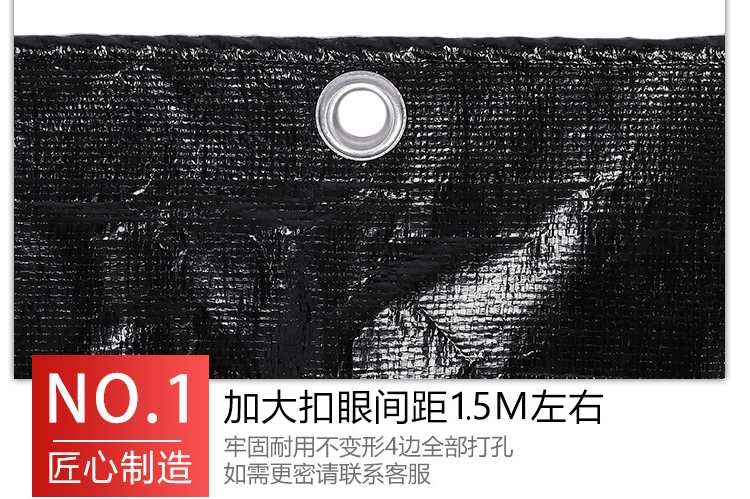 雙黑色PE防水篷布加大扣眼間距1.5m左右,牢固耐用不變形,4邊全部打孔,如需加密請告知。